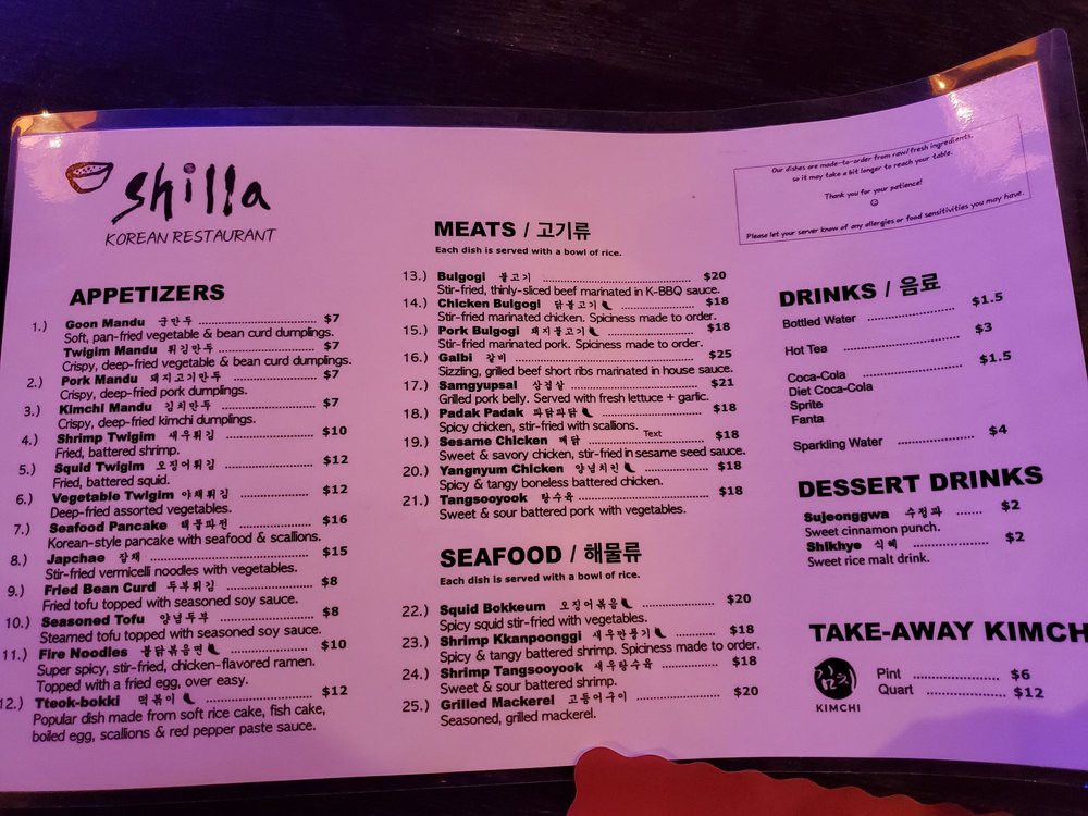 Welcome to Shilla Korean Restaurant, located in the heart of Sarasota, where authentic Korean seafood flavors take center stage. Their menu is a culinary journey that showcases an impressive array of dishes. Highlights include the robust Seafood Jjamppong ($24) and the rich, stir-fried Jjamppong ($22), perfect for noodle lovers. The biannual Bibimbap ($16) is a must-try, featuring a delightful mix of vegetables and protein, while the Seafood Soondubu Jjigae ($22) offers a comforting, spicy experience. Guests rave about the delicious seafood pancake and tender Galbi, both celebrated for their flavor. Regulars describe the ambiance as warm and inviting, complemented by attentive service that makes you feel at home. With dishes crafted from fresh ingredients, each meal promises to be memorable. Experience Korean cuisine at its finest—you won't be disappointed!